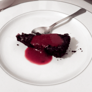 - Sift the flour and cocoa powder on top of the blood/sugar mixture, a little at a time, and fold it gently with a wooden spoon. Don’t pour it all at once or it will sink to the bottom of the bowl.